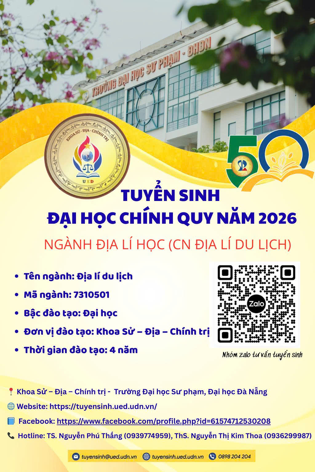 Ngành Địa lý học (Chuyên ngành Địa lý Du lịch) Ngành Tâm lý học Ngành Việt Nam học (Chuyên ngành Văn hóa – Du lịch)