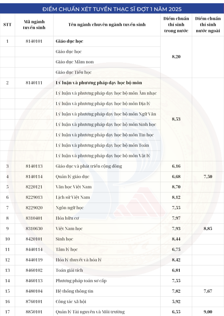 Hội đồng tuyển sinh Trường Đại học Sư phạm – Đại học Đà Nẵng (ĐHĐN) công bố điểm chuẩn tuyển sinh trình độ Thạc sĩ đợt 1 năm 2025, cụ thể như sau: